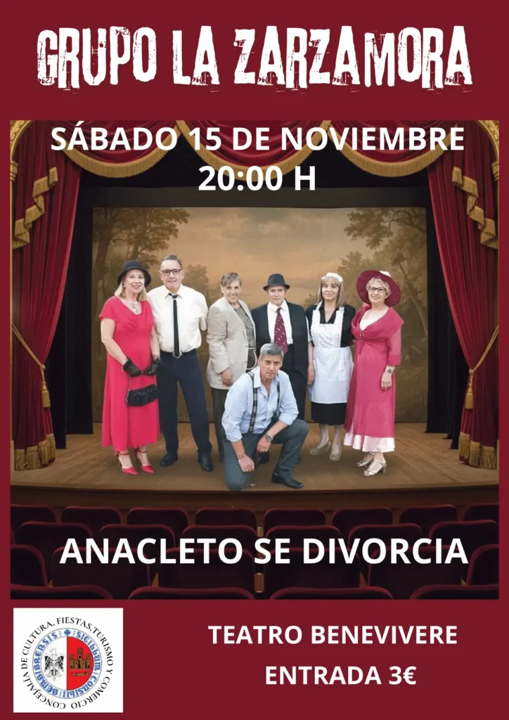 El grupo La Zarzamora, de Folgoso de la Ribera, presenta su nuevo montaje en el teatro Benevivere: “Anacleto se divorcia”. Una función que sigue en la línea de la comedia que exploraron con anteriores propuestas, para deleitar al público en la tarde del sábado.